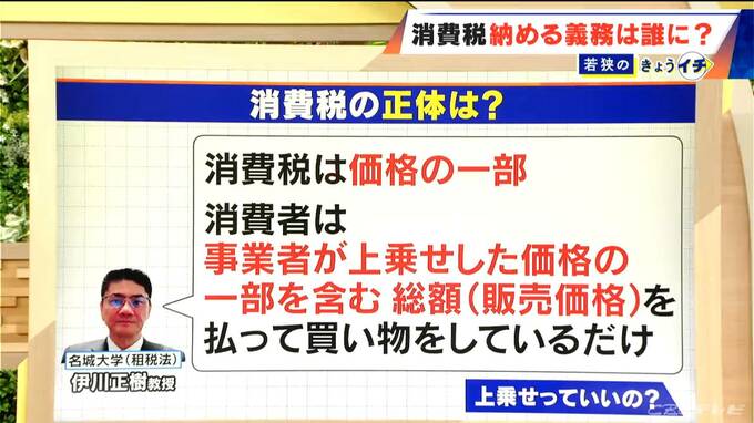 伊川教授によると、「消費税は価格の一部。消費者は事業者が上乗せした価格の一部を含む、総額(販売価格)を払って買い物をしているだけ」とのことです。