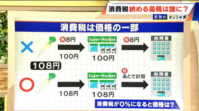 例えば、スーパーで108円の大根を買ったとします。皆さんの頭の中には、大根100円・消費税8円と分かれていて、事業者が税務署に8円を納めている。こういう認識だと思いますが、これは違います。