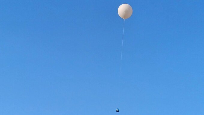 青空に浮かぶ白い風船。大きさは直径2メートルほど。そこから紐のようなものが伸びて、その先には銀色の球体がぶら下がっています。