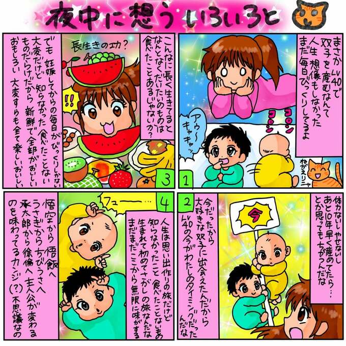 翔子さんは「まさかLV40で双子を産むなんて人生」「想像もしなかった」「まだ毎日びっくりしてるよ」と述懐。もっと若くで産んでいたらという思いも無いではないものの、「今だったから大好きな双子に出会えた」「LV40の今がわたしのタイミングだったんだな」と、自分自身のこれまでを確認しています。