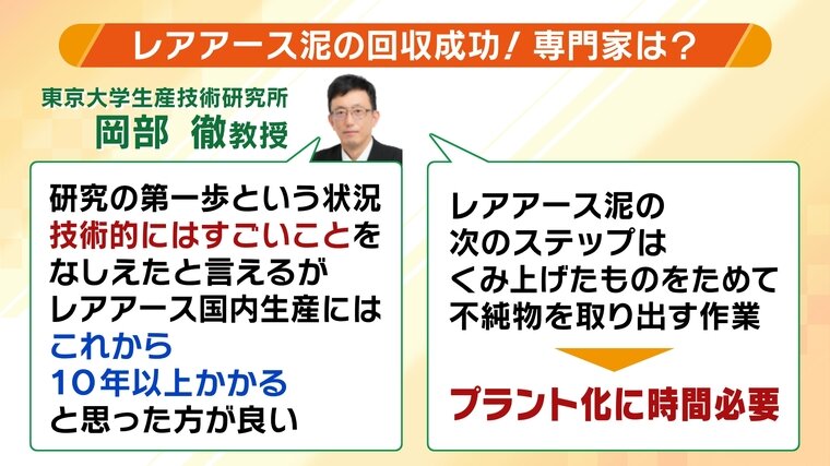 一方で「レアアース国内生産にはこれから10年以上かかると思った方が良い」と言います。次のステップとしては、「くみ上げたものをためて不純物を取り出す作業」が必要で、プラント化に時間が必要だということです。