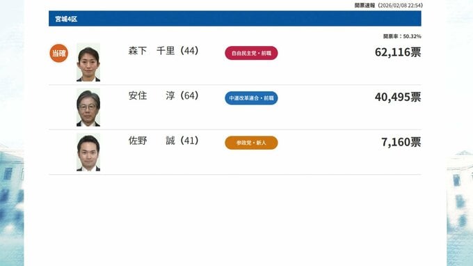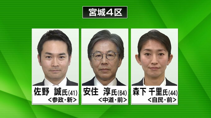 宮城4区は自民党の前職・森下千里氏(44)の当選が確実となりました。