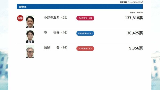 9日午前0時24分時点の宮城5区の開票状況です。