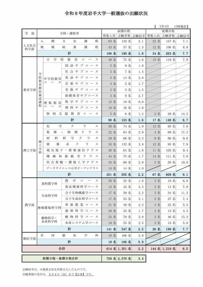 岩手大学 令和8年度一般選抜試験志願状況「確定」 獣医学部共同獣医学科は5.9倍