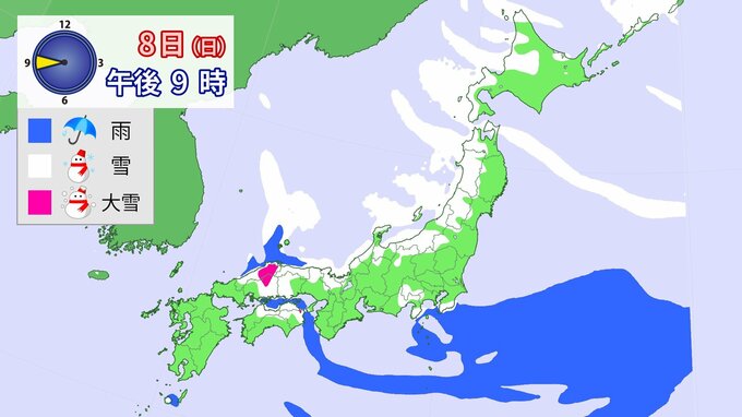 8日ごろは、強い寒気の影響で北日本から西日本にかけての日本海側を中心に大雪となり、寒気の程度によっては警報級の大雪となる可能性があります。