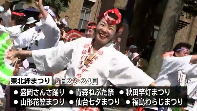 5月23日と24日の2日間、盛岡さんさ踊りのほか青森ねぶた祭、秋田竿灯まつり、山形花笠まつり、仙台七夕まつり、福島わらじまつりの「東北6大祭り」が一同に会し盛岡市役所前から中央通り2丁目交差点までのおよそ1キロをパレードします。