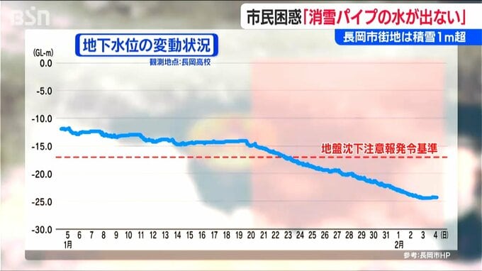 連日活躍した消雪パイプですが、長岡市が観測する地下水の水位を見てみると、雪が多く降り始めた1月20日ごろから減少傾向に。