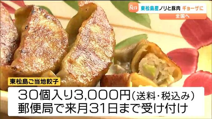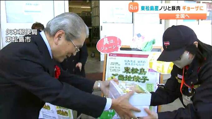 東松島産のノリと豚肉を使ったご当地ギョーザを全国に発送する「ゆうパック」の出発式が、東松島市で4日行なわれました。