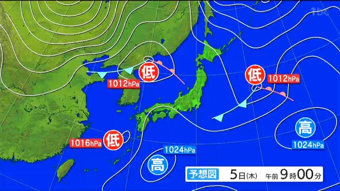 5日午前9時の予想天気図です。低気圧が日本海北部を発達しながら東に進むでしょう。南の海上の高気圧から引き続き暖かな空気が流れ込みそうです。