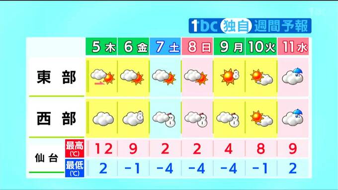 東部は晴れ間の出る日が多いですが、6日から9日にかけては冬型の気圧配置となるため西部では雪の降る日が続くでしょう。気温の変化が大きく、土曜から月曜にかけては再び寒さが厳しくなりそうです。