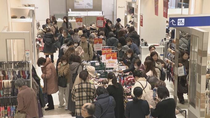 午前10時の開店時間に合わせて訪れた買い物客は約1000人。手袋が1100円、折りたたみ傘も1100円と、以前の値段の6~8割引きで飛ぶように売れていきます。