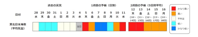 ・2週目の予報は中心の日に前後2日間を加えた5日間の平均(最高気温の5日間平均、最低気温の5日間平均、平均気温の5日間平均)です。平均期間を中心の日の下に表示しています。2週目のかなり高い(かなり低い)は、かなり高い(かなり低い)気温となる確率が30%以上のときに表示します。