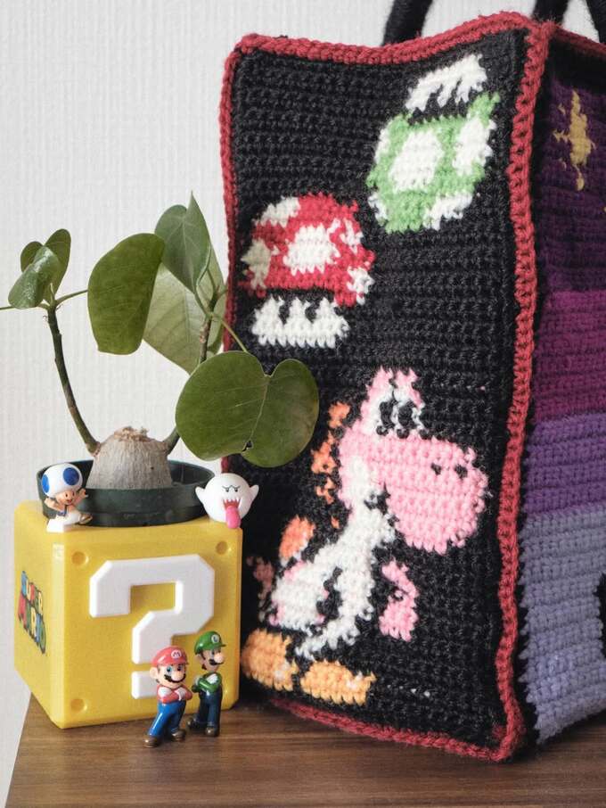 投稿の4枚目にはバッグのマチの面に、1UPキノコ・スーパーキノコ・ピンクヨッシーと思われるキャラクターが編み込まれていて、そのそばにはハテナブロックの植木鉢に青キノピオとテレサのフィギュアが乗っており、テーブルにマリオとルイージのフィギュアも佇んでいます。