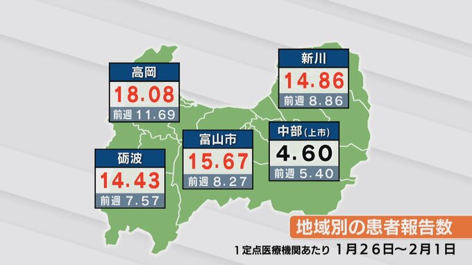 富山県によりますと、2月1日までの1週間に県内の医療機関に報告されたインフルエンザの患者数は1医療機関あたり14.85人と、前の週に比べて5.96人増えました。