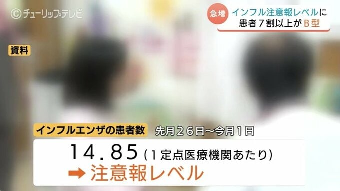 富山県内の1医療機関あたりのインフルエンザの患者数は14.85人となり注意報レベルを超えました。特に「B型」の患者数が急増していて、県は感染対策を徹底するよう呼び掛けています。