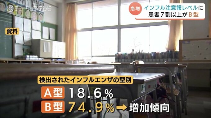 検出されたインフルエンザを型別で見ると、A型が18.6%なのに対しB型は74.9%と、B型が増加傾向にあるということです。