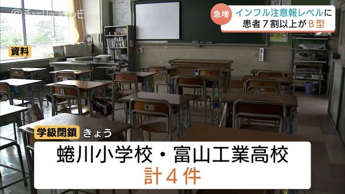 また、4日新たに学級・学年閉鎖の報告があったのは富山市の蜷川小学校と富山工業高校のあわせて4件です。