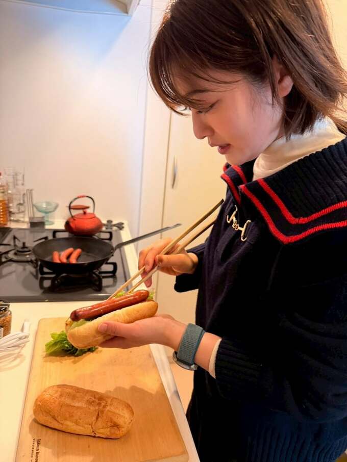 1枚目の写真では「ドライブのおともにホットドックを作りました。粒マスタードたっぷり」と、キッチンに立つ井上さんがフライパンでソーセージを焼きつつ、仕上がったソーセージをコッペパンに挟む様子が写っていて、フォロワーからは「ドライブのお供手作り それが一番美味しい」など、多くの賛同の声が集まっています。