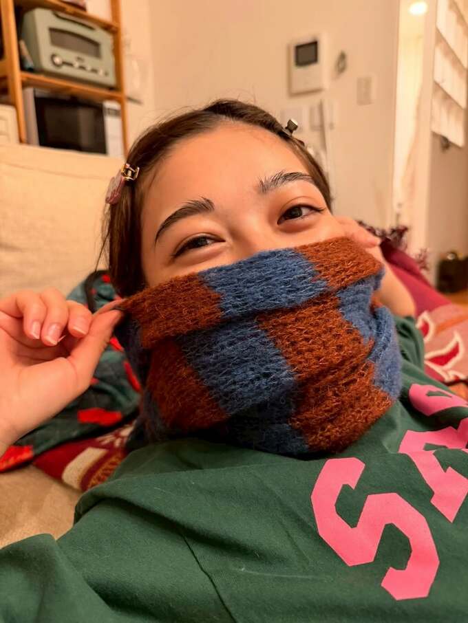 2枚目の写真では、青と茶のシックな色合いのマフラーで顔の下半分が隠れるくらいグルグル巻きにして微笑む姿を投稿。「ようやく完成したマフラーですが、今はソファの下に挟まっています」と、あるあるな様子を説明しています。