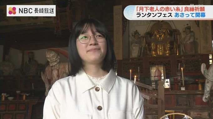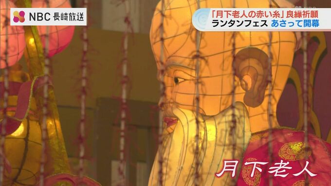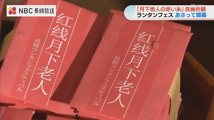 6日の「長崎ランタンフェスティバル」開幕を前に、縁結びの神様「月下老人」のランタンオブジェに結びつける「赤い糸」の良縁成就祈願が行われました。