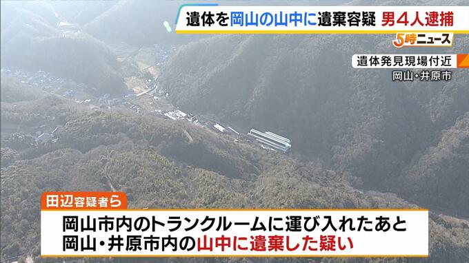 白浜の男性の遺体を岡山まで運び、山の中に遺棄した疑い。男4人を逮捕です。 死体遺棄の疑いで逮捕されたのは、岡山市中区の建設作業員・田辺昌幸容疑者(53)と住居不定・無職の西勝将容疑者(52)ら男4人…