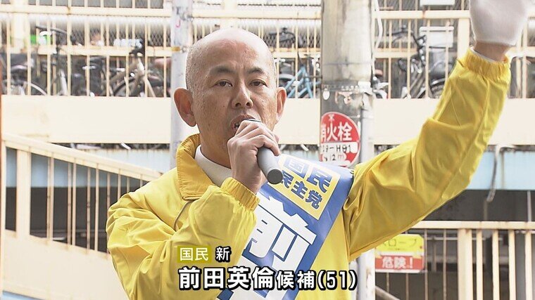 (国民・新人 前田英倫候補)「30年も40年も一生懸命働いて、働いて、年金と貯金で生活ができない、おかしいじゃないですか。皆さまの手取り、生活を守る。その法律を私が国会に行って作る」
