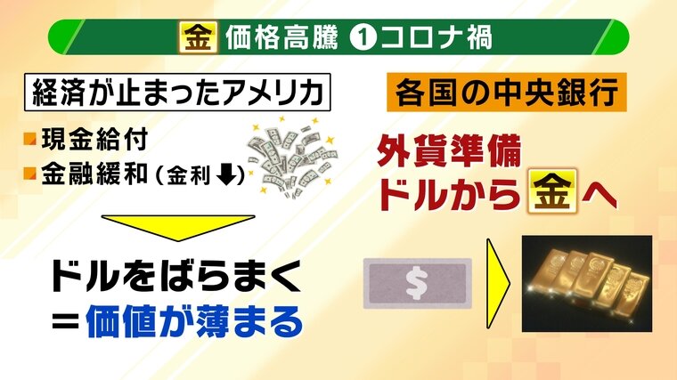 その後、高騰したのがコロナ禍のタイミングでした。経済が止まったアメリカで、現金給付・金融緩和が行われ、ドルがバラまかれ価値が薄まり、それを受けて各国の中央銀行は金による外貨準備を増やしたのです。