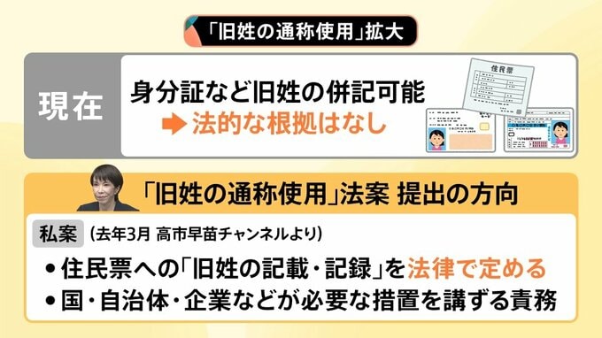 そんな中、高市総理は2026年の通常国会で「“旧姓の通称使用”に法的根拠を持たせる法案」を提出する方向で検討しているということです。