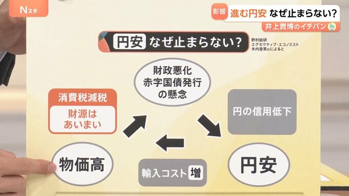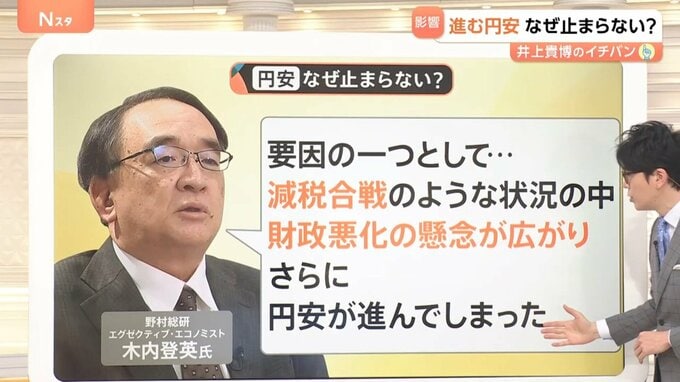 野村総研 エグゼクティブ・エコノミストの木内登英さんは、「要因のひとつとして…減税合戦のような状況の中、財政悪化の懸念が広がり、さらに円安が進んでしまった」と言います。