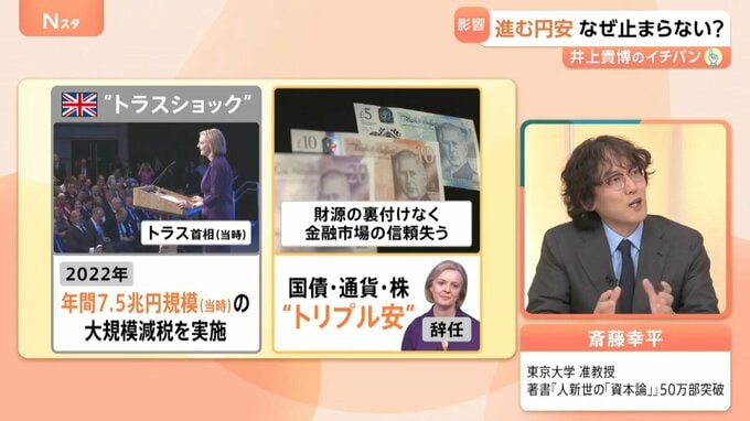 過去にも似たようなケースがありました。2022年、イギリスのトラス前首相が、財源の裏付けがないまま年間7.5兆円規模(当時)の大規模減税を実施しました。その結果、金融市場の信頼を失い、ポンド安、金利上昇、国債価格の下落、さらに株安にまで繋がってしまい、トラス前首相はとても短い期間で辞任に追い込まれてしまいました。
