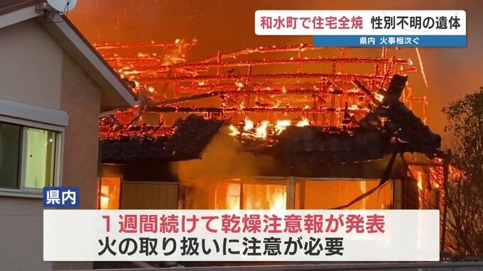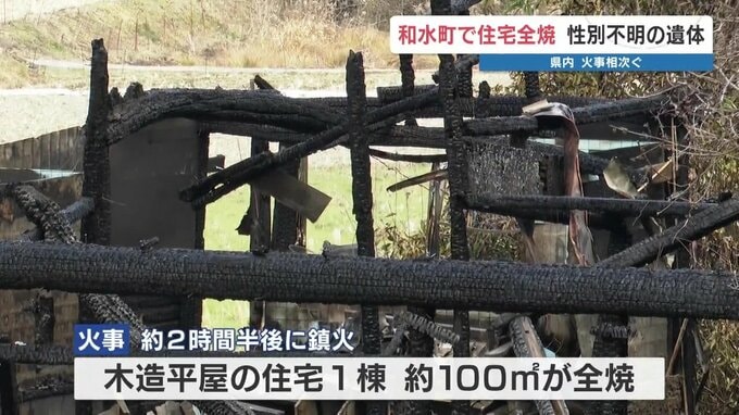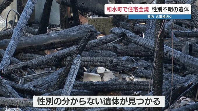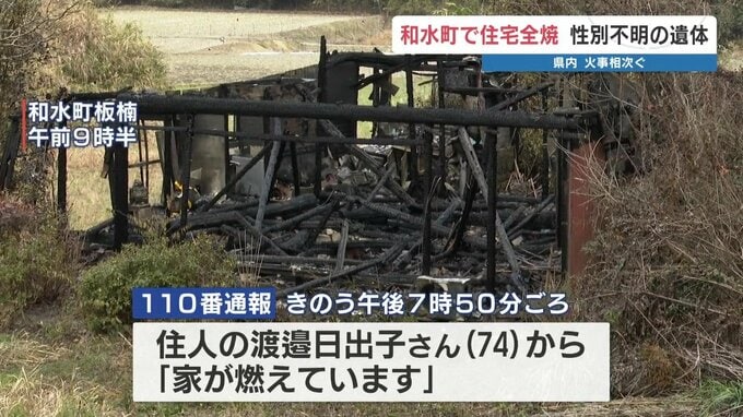 和水町では住宅1棟が全焼し、焼け跡から性別の分からない遺体が見つかりました。午後7時50分ごろ、和水町板楠で、この家に一人で住む渡邉日出子さん(74)から「家が燃えています」と110番通報がありました。