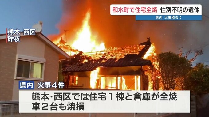 熊本県内では3日夜から4日朝にかけて4件の火事が起きていて、熊本市西区では、住宅一棟と倉庫が全焼し、車2台も焼けました。
