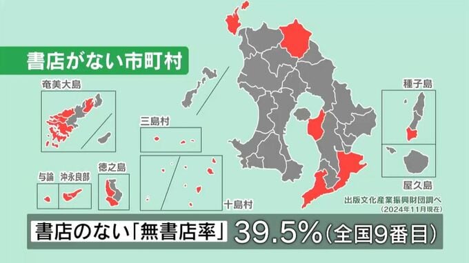 出版文化産業振興財団の調査によりますと、おととし時点で県内では垂水市、伊佐市など17の市町村に書店がなく、書店のない「無書店率」は全国で9番目に高い39.5%でした。