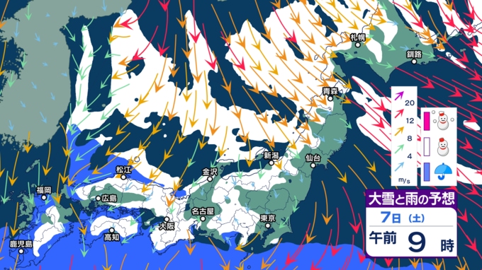 また、その後の翌8⽇(日)頃は、強い寒気の影響で北⽇本~⻄⽇本にかけての⽇本海側を中⼼に⼤雪となり、寒気の程度によっては「警報級の⼤雪」となる可能性があるとみられています。