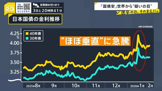 財政リスクを反映しやすい「超長期国債」にも売りが殺到し、金利は“ほぼ垂直”に急騰。