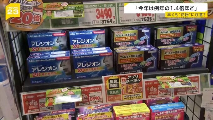 「都内の薬局に来ています。ありますね、一番目立つどころ。花粉対策のグッズのコーナーがあります。目薬や鼻炎薬が並んでいます」