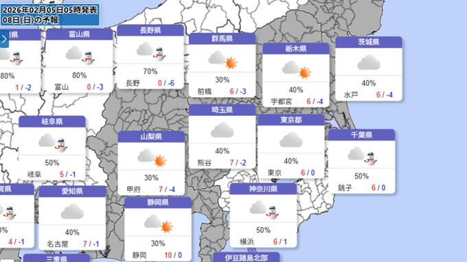 【関東の雪は?】8日(日)東京は降水確率40%「雨か雪」の可能性 千葉・神奈川に雪マーク 気象庁が太平洋側の雪に注意呼びかけ 雨雪シミュレーション 長崎放送 2026年2月5日(木) 06:47 国内 「普段雪の少ない」場所でも雪の可能性 【画像を見る】◆全国◆関東◆関西◆九州 雨雪シミュレーション 最新の週間予報では、8日(日)の関東地方は、千葉県と神奈川県で「雪」予想となっています。 東京は「曇り」、降水確率は40%。最低気温0℃・最高気温6℃と厳しい寒さが予想されています。 気象庁は「普段雪の少ない西日本や東日本の太平洋側でも雪が降る所がある」との予想を示しています。