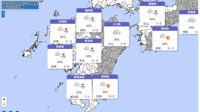 【九州の雪は?】8日(日)福岡・佐賀・熊本・長崎・鹿児島に雪マーク 「普段雪の少ない太平洋側も雪の可能性」気象庁 雨雪シミュレーション 長崎放送 2026年2月5日(木) 08:03 国内 福岡・佐賀・熊本・長崎・鹿児島に雪マーク 気象庁の予報によりますと、7日(土)は九州全域で雨予想となっています。 【画像を見る】◆関東 ◆全国 ◆東日本◆九州 雨雪シミュレーション また8日(日)は福岡・佐賀・熊本・長崎・鹿児島で「雪」が予想されています。最低気温は氷点下2度~1度と厳しい冷え込みになる予想となっています。