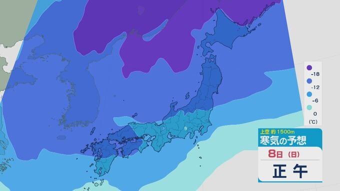 日本海では北よりの風が強く、上空およそ1500メートルの寒気の予想は、8日(日)で九州や中国・四国でも-12度以下とかなり強まるでしょう。