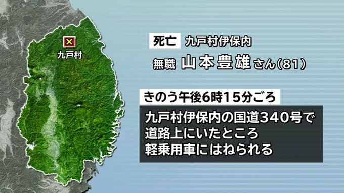 4日午後、岩手県九戸村の国道で近くに住む81歳の男性が軽乗用車にはねられ死亡しました。亡くなったのは九戸村伊保内の無職・山本豊雄さん(81)です。警察によりますと、山本さんは4日午後6時15分ごろ、九戸村伊保…