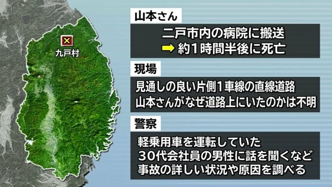 警察によりますと、山本さんは4日午後6時15分ごろ、九戸村伊保内の国道340号で道路上にいたところ軽乗用車にはねられました。