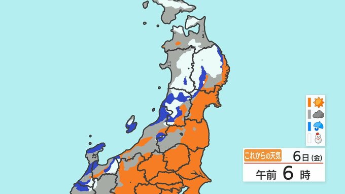 東北地方では、低気圧や冬型の気圧配置の影響により、雪を伴った西よりの強い風や大雪となる所がある見込みです。6日未明から夜遅くにかけて、雪を伴った強い風に注意・警戒してください。また、7日から8日頃にかけて、日本海側を中心に大雪に注意・警戒してください。