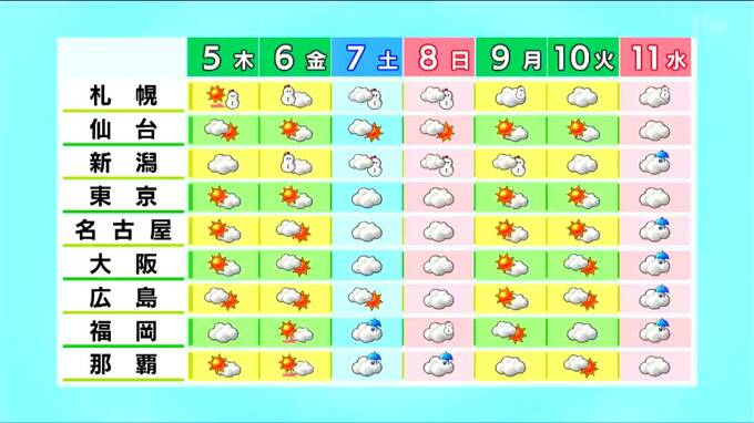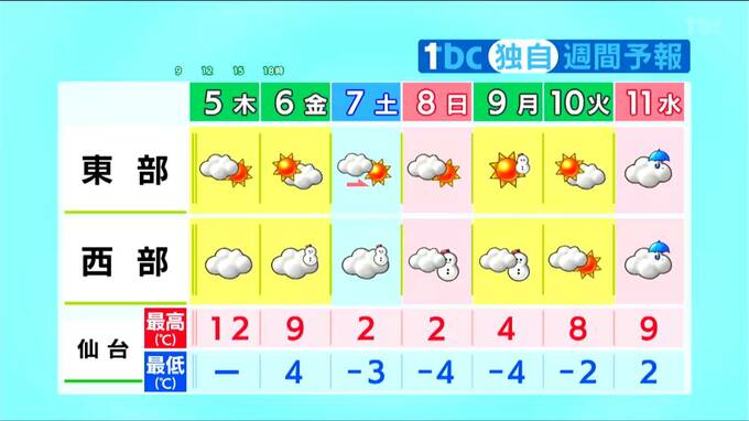 寒さも厳しくなり、仙台の最高気温は土曜、日曜ともに2℃までしか上がりません。最低気温も氷点下4℃前後まで下がるところが多くなりそうです。風も土曜から月曜にかけて強まりますので、強風にもご注意ください。
