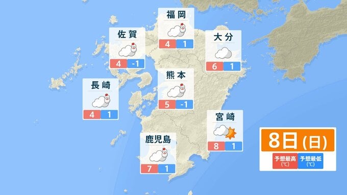 5日(木)午前11時発表の天気予報で、8日(日)は、福岡・佐賀・長崎・熊本・鹿児島に「雪」の予報が発表されました。