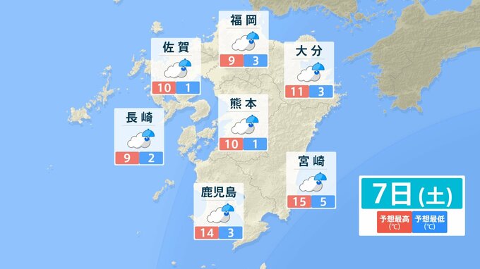 また、7日(土)は九州全域で「雨」マークの予報ですが、福岡・佐賀・長崎・大分・熊本の予報文は「くもり 一時 雨か雪」となっており、寒気の強まりによっては、雪の可能性が高くなるでしょう。