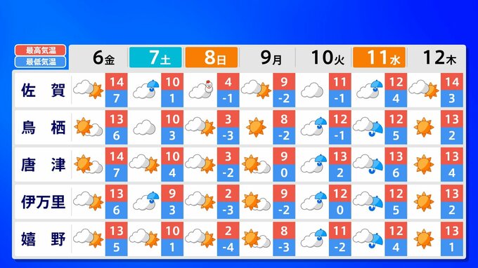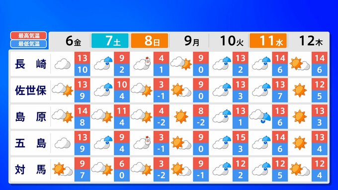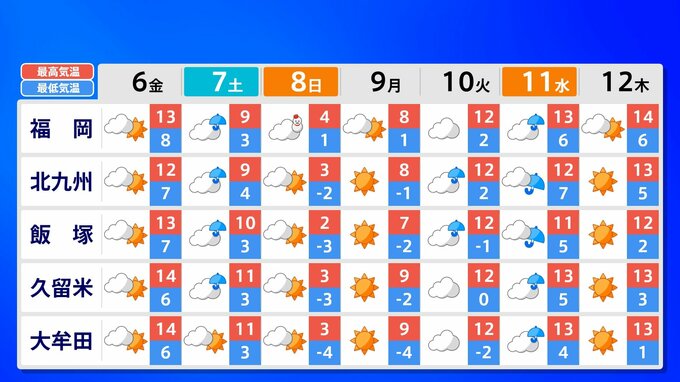 8日(日)各県に「雪の予報」が出ています。また寒さも厳しく8日(日)の最高気温は、福岡市・佐賀市・長崎市4℃、熊本市5℃、北九州市3℃の予想です。