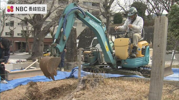 記念碑が設置されるのは、長崎原爆資料館前の市の敷地内で、5日は、被爆者らもあつまり、工事が始まりました。