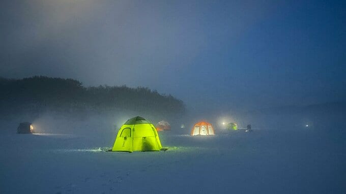 「朝5時過ぎの盛岡市薮川の岩洞湖です。あたりはまだ真っ暗ですが、さっそくワカサギ釣りの準備をしている人の姿が見られます」