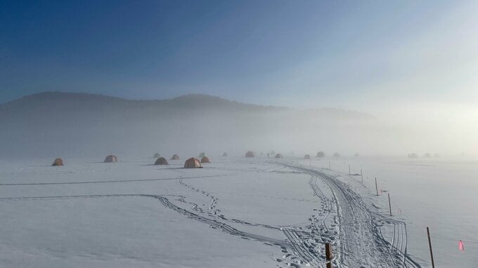 5日は解禁を待ちわびた人たがさっそく岩洞湖を訪れ、氷の上にテントを張っていました。