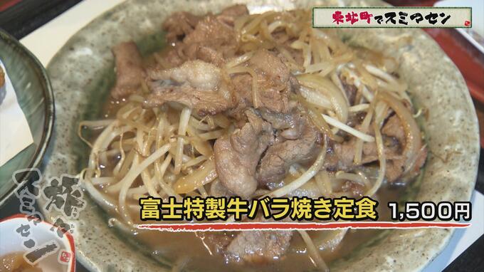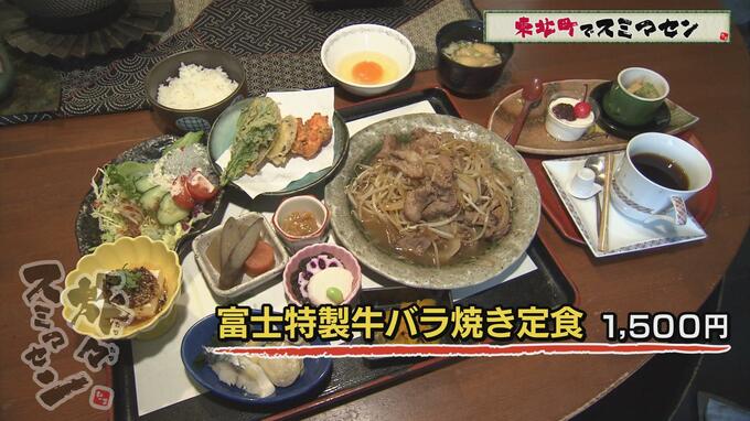 川口さんは【特製牛バラ焼き定食】(1500円)を注文。特製牛バラ焼き、天ぷら、数種の小鉢、スイーツ、コーヒーと10品以上がついています。